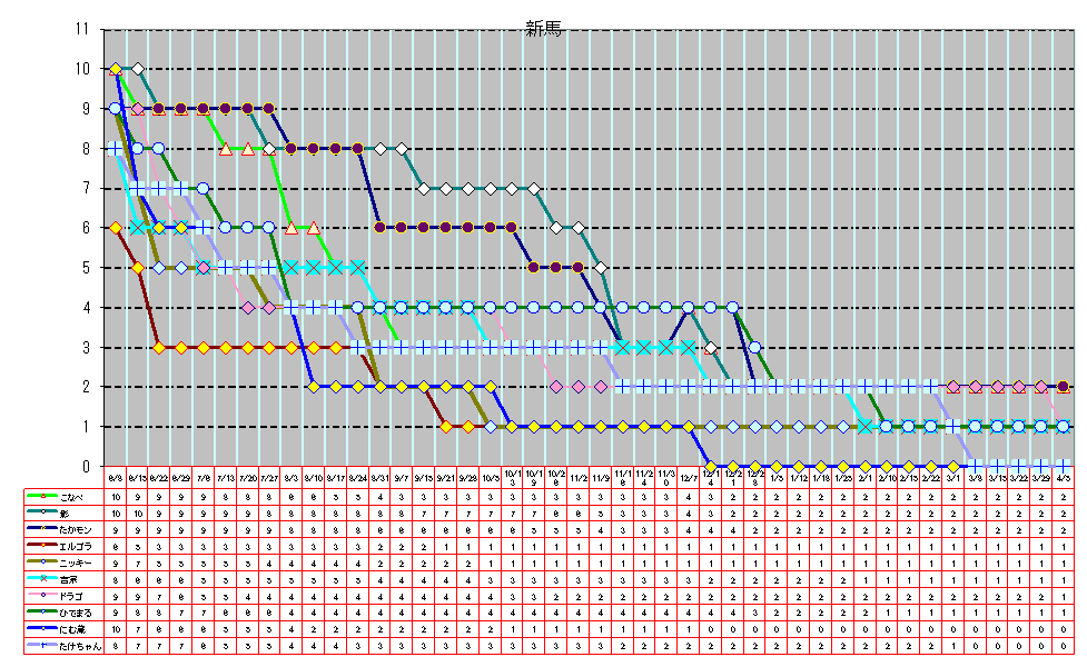 | 第36週:02/07(土)〜02/10(火) | POG | 古馬 | 1位T | 2 | ±0 | 1位T | 2 | ±0 | 1位T | 2 | ±0 | 1位T | 2 | ±0 | 6位T | 1 | ±0 | 6位T | 1 | ±0 | 6位T | 1 | ±0 | 6位T | 1 | -1 | 10位 | 0 | ±0 | 1位T | 2 | ±0 |