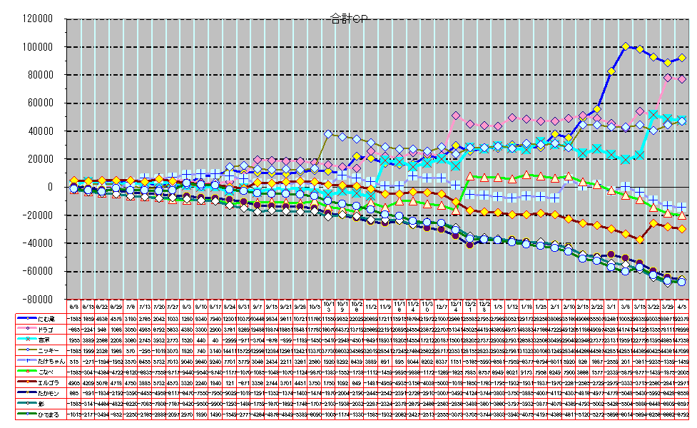 | 第37週:02/14(土)〜02/15(日) | POG | 古馬 | 2位 | +49066 | +13906 | 1位 | +51186 | +2066 | 4位 | +23946 | -5094 | 3位 | +44266 | +15926 | 6位 | +826 | -5094 | 5位 | +3666 | -4234 | 7位 | -25654 | -3044 | 9位 | -48164 | -5094 | 8位 | -47934 | -4244 | 10位 | -51204 | -5094 |