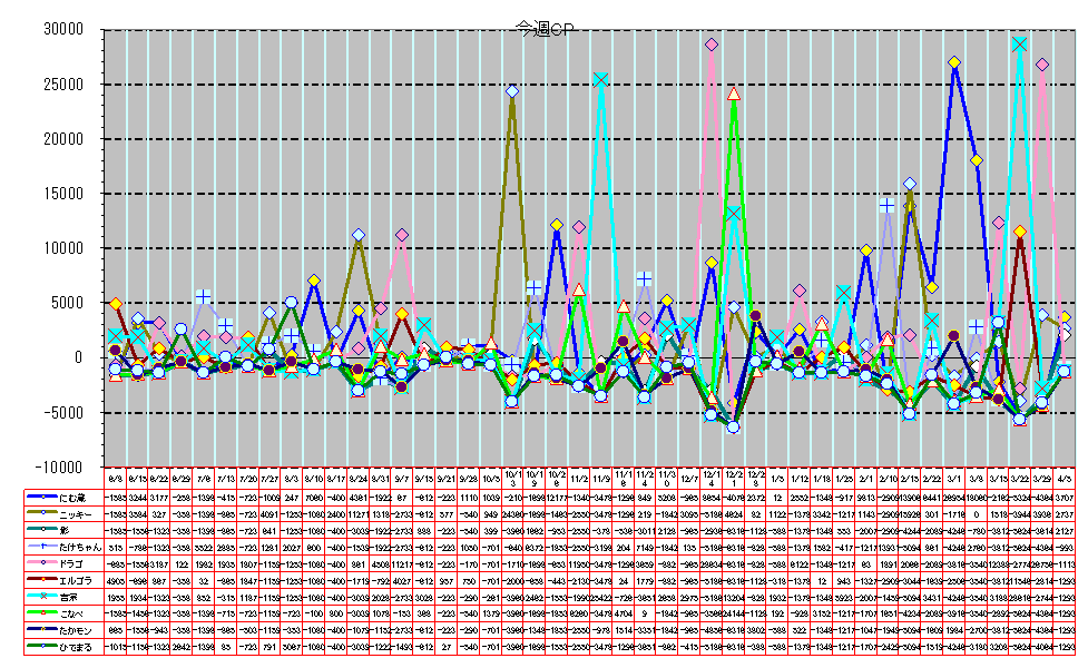 | 4↑( 7) | たけちゃん | -993 | +3371 | -4364 |